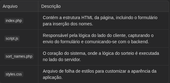 A mágica acontece no arquivo sort_names.php. O script PHP recebe a lista de nomes enviada pelo frontend, processa os dados e retorna um único nome sorteado. O trecho de código a seguir demonstra a lógica principal: